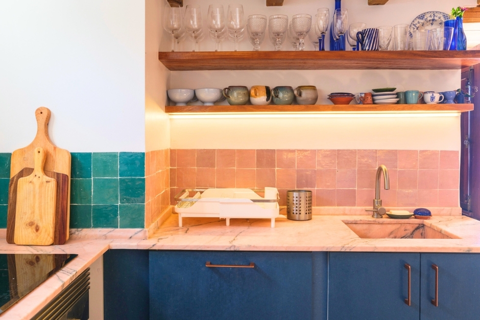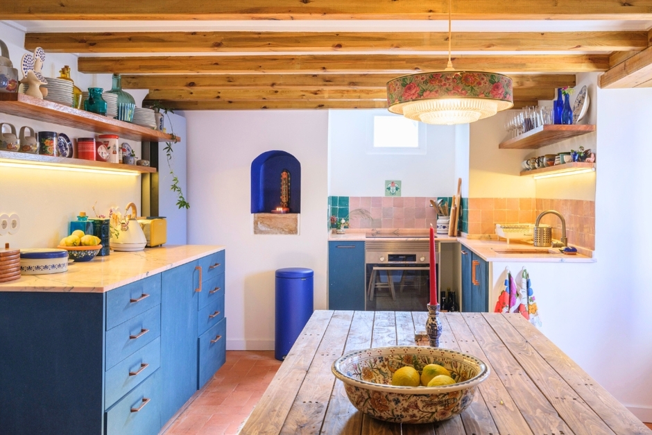 Colorful Casa. Recently renovated and designed by a creative actress and photographer team, the house oozes artistic style and charm. The decorative process paid close attention to local materials adding statement colors and touches of contemporary freshness to the traditional casa building. Original features and period detailing such as the brick floors, baseboard tiles, fireplaces, doors and window shutters have been preserved and uplifted by vintage finds, lamps and furniture. The stunning wall fresco in the living room is by the host’s friend, the artist Tomás Colaço. Modern upgrades include new windows, bathrooms, kitchen and wood flooring add some warmth, comfort and luxury. We love the panoramic views from the huge picture windows in the primary bathroom, and the bold color scheme and hand picked tiled that make each space unique.