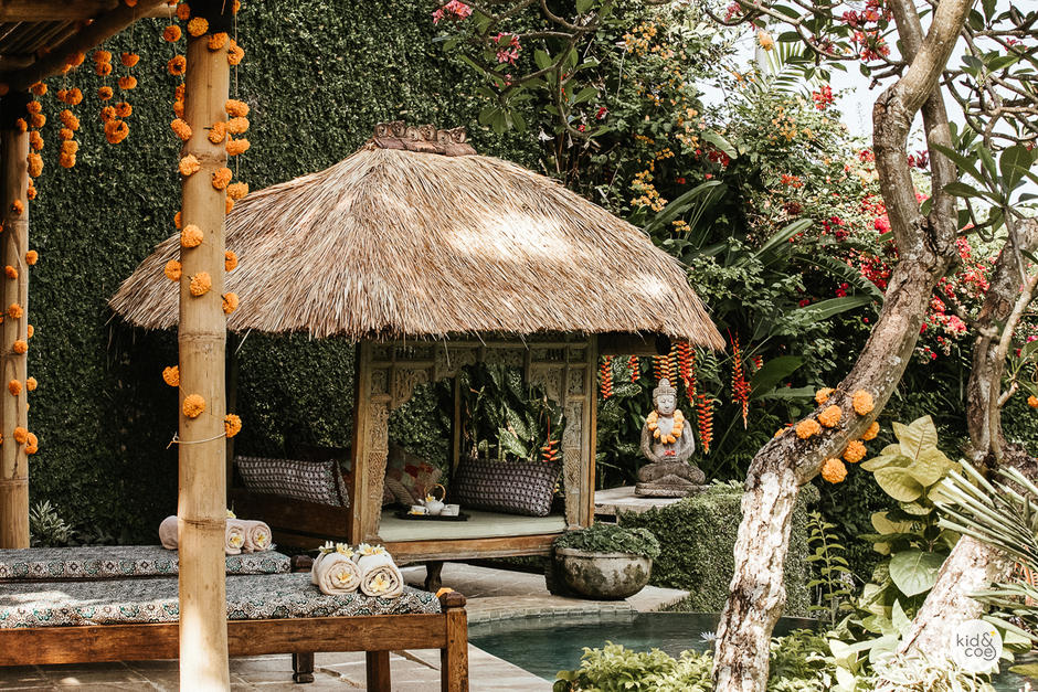 Modern bohemian. This beautiful villa draws inspiration from interiors all over the Indonesian archipelago, and has been lovingly decorated with treasures and collectables. A regular feature in design blogs and magazines (including Garance Dore, Belle Australia and Danish Elle), it is a large open grass thatched roof villa with indoor-outdoor flow. There are 1.6 acres of tropical gardens, including a pool and lounge areas. We love the luxurious, tropical spaces, the semi-outdoor bathroom and the divine wooden day bed beside the pool.