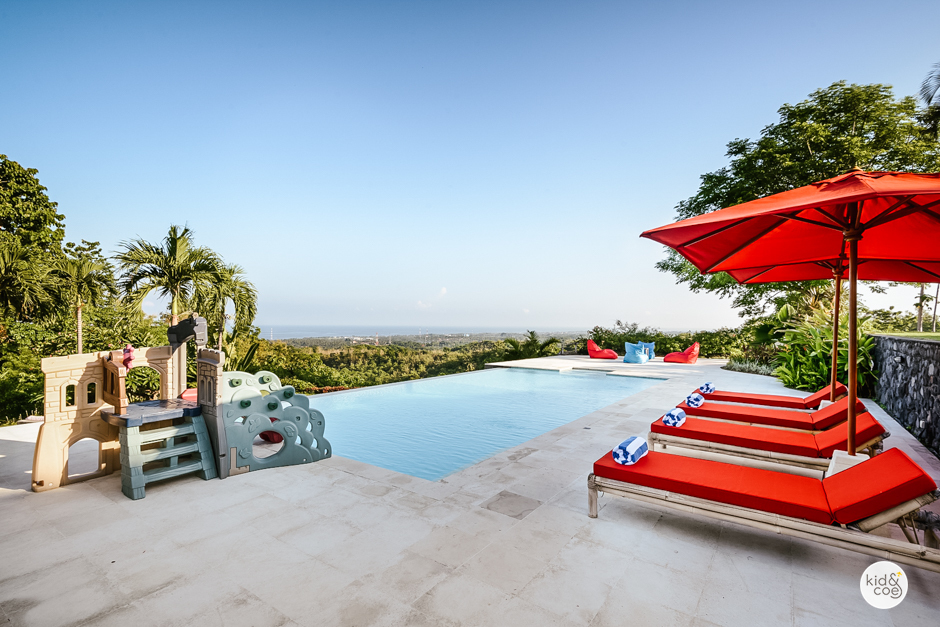 Modern, light, and functional. The villa is built with kids in mind, and has an indoor-outdoor vibe, with nature, views and villa comforts connected. The covered but open terrace and the living room are joined with sliding doors to create a massive open space is fantastic for children to play. The kitchen is adjacent but closed with a door, so it's safe away from children with in-built oven, stove, and all high end kitchen machinery. We love the tropical gardens, the vast high-ceilinged lounge and the views from the pool and the yoga deck.