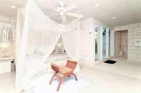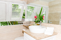 This 9-bedroomed house is surrounded by tropical gardens and has a 50ft pool; of these bedrooms, 7 are in the main house and 2 are in a building set beyond the pool. Four of the bedrooms in the main house are on the ground floor with 3 on the floor above it. Every bedroom has a kingsize bed and ensuite bathroom. Some bathrooms have semi-outdoor showers. There are multiple lounges inside the villa and secluded seating areas in the garden, which also has a brick pizza oven, table tennis table, shuffleboard, volleyball and basketball courts. There is a games room with championship sized billiards table and indoor air-conditioned racquetball court, and a gym with weights, treadmill, exercise bike and more.