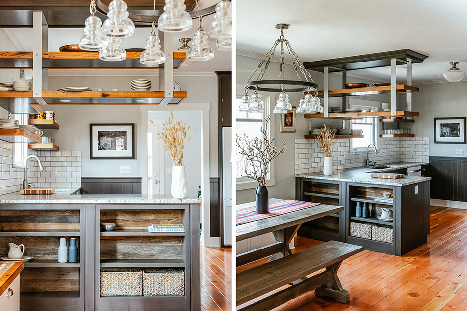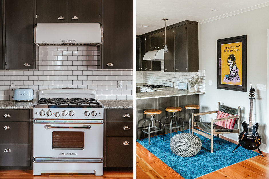 Contemporary cabin. The house is modern with some rustic, mountain touches to create a welcoming and relaxing feel. The kitchen has white subway tiles and a bright white Big Chill stove - the perfect complement to the chunky wood furnishings. There are locally-made wood paneled doors on bathrooms and bedrooms, as well as cozy Pendleton blankets and colorful works of art. We love the multiple windows in the boot room, the industrial-style bar stools at the breakfast bar and the unique exterior brickwork framing the charming step-up porch.