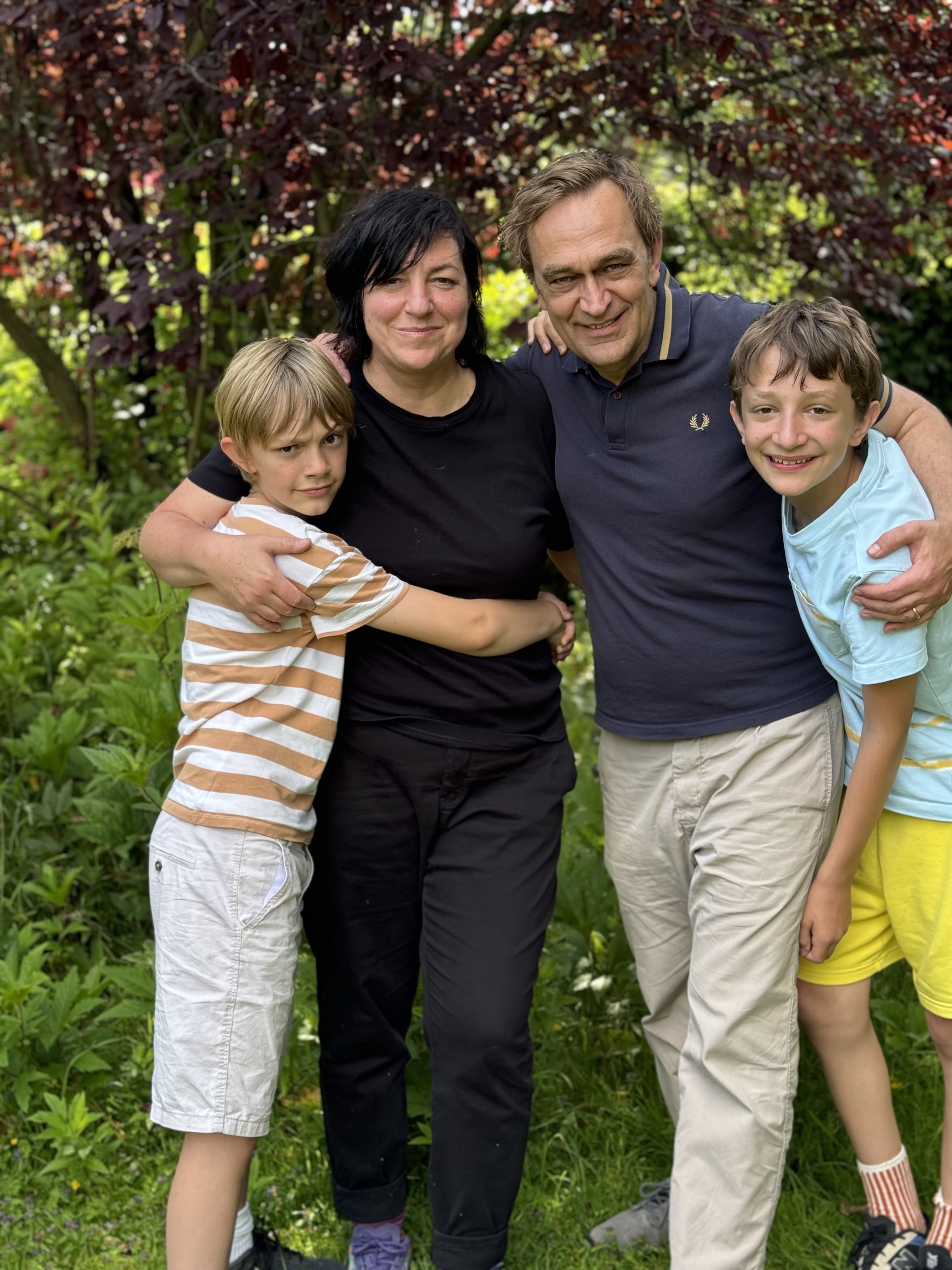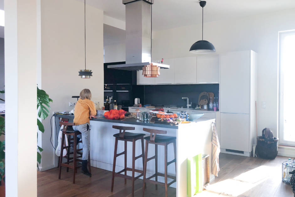 The residence is 230sqm, with 3 bedrooms and 2 bathrooms, plus 3 terraces, set over 1 floor. The central living space is an open plan style kitchen-diner-living room which includes a fully stocked kitchen with a dishwasher, a kitchen island seating 4 on bar stools, and a double chaise sofa, large enough to seat all the family. Bifold doors open onto the biggest terrace with space for at least 6 people on the dining table, with views over the rooftops of Berlin to the Alexanderturm. Two corridors leave this centre room in two directions and offer access to the bathrooms and bedrooms: a primary with a kingsize bed, a second bedroom with a queensize bed and a third kids’ bedroom that sleeps 4, with a single-over-double bunk bed, plus 1 single pull-out bed and plenty of toys. The host also has a double air bed and 1 fold-out mattress if required. There are 2 bathrooms; the primary has a bathtub and double sinks. As well as the larger terrace, there are also 2 other terraces, with smaller tables for 4 people and outside beds (for 2 persons each).