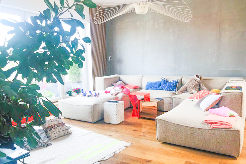Bright and botanical. This joyful apartment has been decorated with zest featuring bold, colour drenched walls in neon coral, electric blue and deep yellow, alongside statement Scandinavian wallpapers. A leafy vibe runs throughout from the plant-filled balconies to the indoor palms and botanical plant and tree designs of the various wall papers. The living room injects some industrial chic into the mix with an exposed concrete wall, a contemporary chaise longue/sofa and a sleek, modern kitchen with elegant bar stools and low hung pendant lighting. We love the apartment’s roof top position with its 3 relaxing terraces offering a leafy place to sit, relax or dine, with front row seats for watching the sunset over the city.