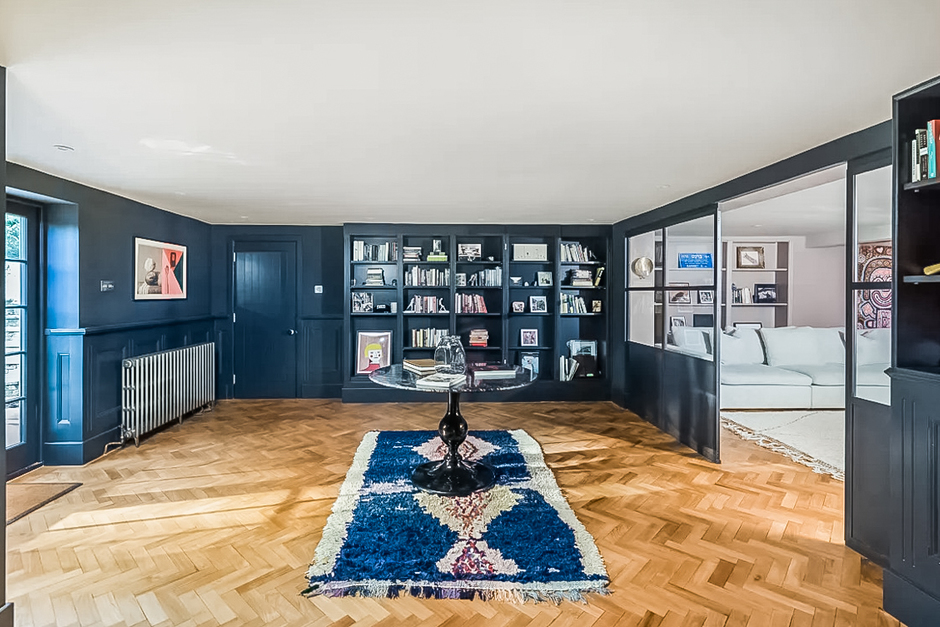 Bright and beautiful. The hosts have created a light, modern and chic interior. The house is positioned on a south-west/south-east axis so that the gorgeous kitchen/living room and principal bedroom suite both have lovely views across the garden from huge floor-to-ceiling windows. Despite its classic and elegant styling, there are hints of an eccentric edge, such as the dusty pink hue of the primary ensuite bathroom, the bold and colorful modern artwork on the walls and the playful Moroccan rugs throughout. We love the tall picture windows with built-in oak window seats which run around the perimeter of the kitchen, with southerly views across the beautiful garden, as well as the pink chandelier hanging over the bespoke marble table and that grand library space.