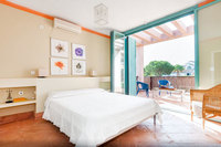 The villa is bright and light, full of sunshine and with sliding doors from the living space to the outdoor terrace and garden to make the most of it. Walls are painted turquoise and blue - the colors of the sea - and the floor is a traditional terracotta tile. The overall effect is calming, classic and joyful. We love the sofa loungers on the terrace, beside blossoming flowers, and the cobalt blue wicker chairs.