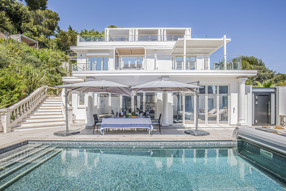 This opulent villa in the heart of Antibes has a luxurious rooftop terrace for decadent sunbathing with stunning views of Cap d’Antibes, a hot tub and heated pool. It sleeps up to 12. The villa is set up with parties, dining, sunbathing and fun in mind. The pool is arranged at the center, where there’s also an infra-red sauna and a poolside gym. The pièces de résistance are the 2 rooftop terraces, with incredible views of the Mediterranean Sea. The lower terrace has a bar, sun loungers, al fresco dining table and lounge area. The upper terrace has a hot tub and more sun loungers. Parents will enjoy the air con, smart TVs in all rooms, and bathrobes and slippers.