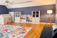 The house has 5 bedrooms and 3.5 bathrooms, set over 2 floors. On the main floor, you’ll find a family room, library, living room and kitchen with a breakfast bar and family-sized dining area. Upstairs, the spacious primary bedroom has a kingsize bed and a separate shower, soaking tub and baby bath tub. It also boasts a terrace that overlooks the pool and back acreage of the property. Two of the guest bedrooms have bunk beds and one of those rooms also has a full sized crib and matching changing table/dresser from Pottery Barn Kids. The in-law suite is ideal for visiting relatives or a nanny/au pair, fitted with a queensize bed and an ensuite bathroom. There is a playroom in a mid-level floor between the first and second floors next to the in law suite. The second floor can be accessed via the main staircase or through the dining area.