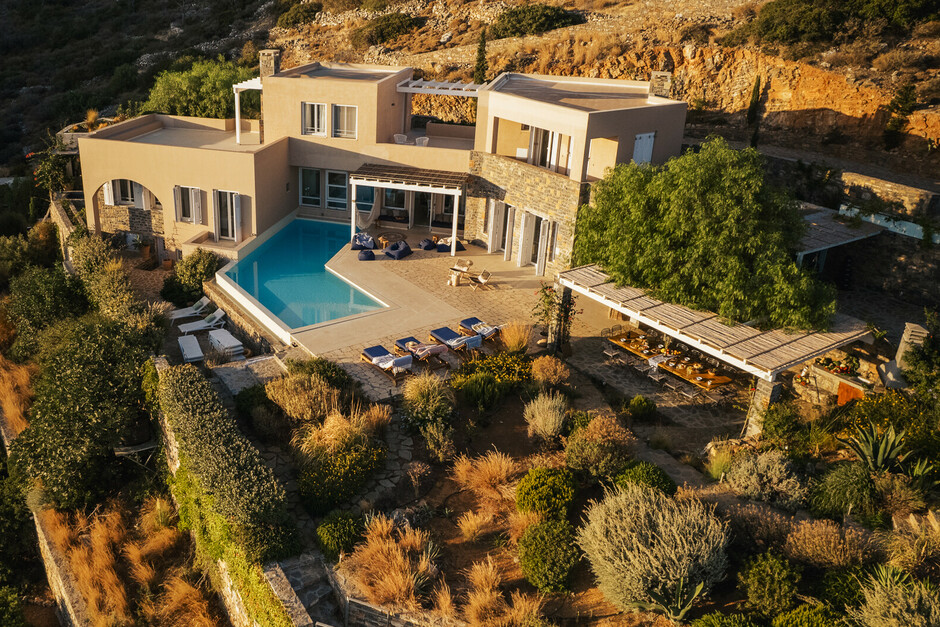 The villa is 3km outside Elounda, a small former fishing village on the north coast of the island of Crete. Elounda is a top luxury destination and is known for its discretion and privacy where high-profile guests can escape the crowds. For serene waters and sand, the nearest beach is Elounda Aquila Hotel beach, about a 7-minute walk. The must-see Bronze Age archeological site of Knossos is a 40-minute drive and day boat trips run to the uninhabited island and former leper colony of Spinalonga. Heraklion International Airport, the main airport on the island, is 1 hour, 10 minutes taxi or car ride along the coast, while the nearest port is at Agios Nikolaos. Car hire is recommended to reach the nearby beaches and explore the villages and their restaurants.