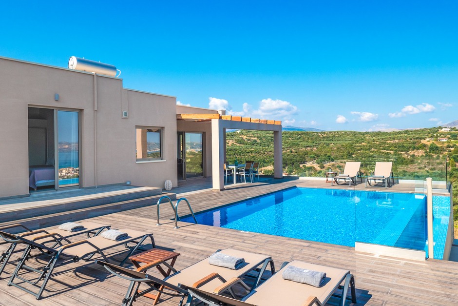 The villa is located in Western Crete, in an elevated spot between the White mountains and pretty Souda Bay. It overlooks the seaside town of Almyrida which has 3 beaches and water sports as well as bakeries, a supermarket and beachside tavernas just a 15-minute walk downhill or a 5 minute car journey away. There are taxis back for guests who prefer not to walk both ways. The inland villages of the Apokronos, including Plaka and Gavalochori are under 10 minutes’ drive away while Chania town, with its Venetian harbour, market and excellent shops and restaurants, is 35 minutes’ away by car. Boat hire is available from Kalves a 5 minute drive away. The inland freshwater lake Kournas is a 35 minute drive away and is perfect for swimming and picnics with the opportunity to visit various vineyards and olive groves enroute. The airport (at Chania) is a 30 minute drive.