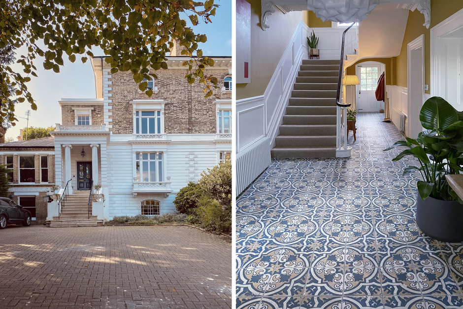 Georgian villa. This classic London home comes with a whole host of beautiful period features, such as high ceilings, decorative cornices, curved banisters and large bay windows. The generous proportions and floor-to-ceiling windows allow light to flood into all the rooms. The hosts have recently renovated in 2021, and opted for mid-century and designer furniture throughout, with plenty of color, pattern and fun! We love the sophisticated wall paneling in the bedrooms, the unique bathroom tiling (check out that terrazzo!) and the elegant parquet flooring in the kitchen.