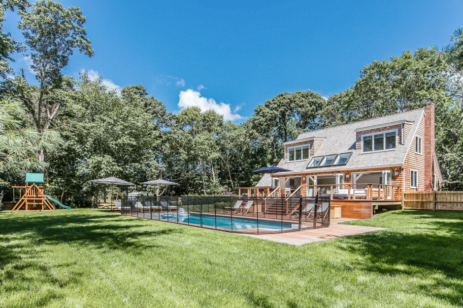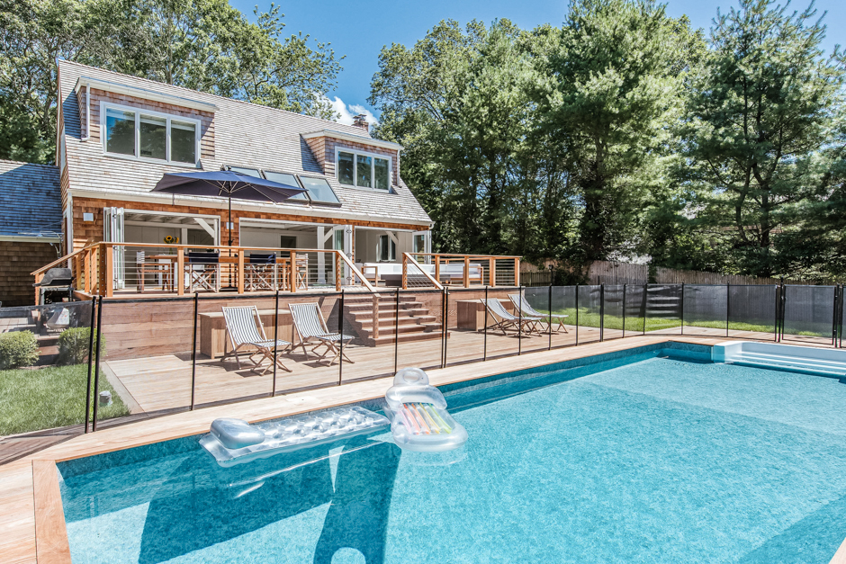 This East Hampton beach house with a pool is a 15-minute walk from the beach and the village, and includes a gaggle of toys and playthings along with immaculate living spaces for all the family to enjoy. This is open plan, indoor/outdoor living at its best: soaring ceilings, a wonderful back deck with fire pit and sofa, a vast kitchen / living /dining space and plenty of privacy and space for all. The 5 bedrooms and multiple living spaces make it easy for a large family or families traveling together to enjoy the East Hamptons lifestyle.