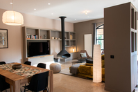 Contemporary casual. The house has been furnished with modern pieces and a minimalist, monochrome style. The space is bright and luminous, with lots of natural light. The garden is manicured and full of color, finished with a spacious al fresco dining terrace with a barbecue and grill. We love the sleek and sophisticated black kitchen, the Crittall-style doors and the contemporary gray fireplace.