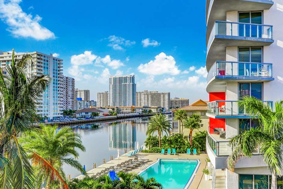 This private residence is located within a hotel, just 1 block from the sandy shores of Hollywood Beach, Florida. During your stay you’ll have access to all hotel amenities, including the building’s gym, pool, on-site dining and concierge desk. The building is located on the Golden Isle Lakes and it’s close to North City Beach Park and South City Beach Park. The nearest airport is Fort Lauderdale-Hollywood International Airport (less than half an hour away).