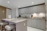 The apartment has 2 bedrooms and 2 bathrooms. There’s a fully-equipped kitchen with an island, plus an eat-in dining table and open plan living space. There’s a coffee machine, toaster, as well as pots, pans and everything else you'd like in a kitchen for cooking a meal. The primary bedroom has a kingsize bed, walk-in closet, TV and ensuite bathroom with an oversized shower. The second bedroom features 2 queensize beds and a large work desk, a TV, ample closet space and a bathroom with a tub. There’s also a sofabed in the living area.