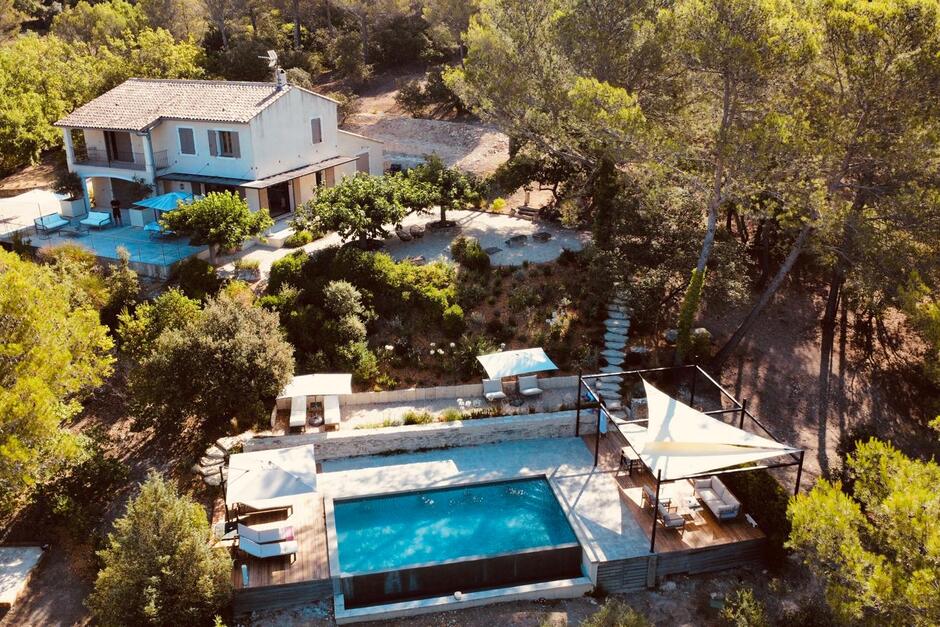 A beautiful country home with an infinity pool set in fabulous extensive grounds, in the heart of Provence’s Luberon valley. It sleeps 9. Parents will love the open plan design of this home, with floor-to-ceiling windows which contract completely into the walls when open, creating a seamless indoor-outdoor experience and allowing you to keep an eye on kids wherever they are. The ground floor has 1 separate bedroom (which can accommodate teens or grandparents), and the option of an additional kids room, so it can be ideal for 2 families or multi-generational trips.