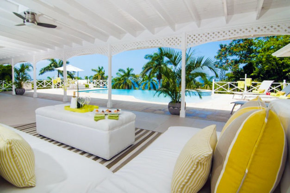 Modern Caribbean. From the cathedral ceilings to the 50ft sliding glass doors in the great room to the infinity pool, this property is truly luxurious. Teak flooring, beautifully tiled bathrooms and sumptuous bedding make it a sophisticated and glamorous place to stay. Eclectic throw pillows, area rugs, and art add cheery, bright pops of color to the neutral, white palette. The kids will love the bunkbed room while the covered terrace is the perfect place for parents to relax with a full view of the pool.