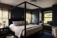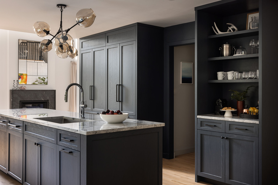 Outdoors indoors. Inspired by the lake's pristine waters and the lush, wooded landscapes that envelop it, the design incorporates subdued tones of blue and green, which not only enhance the visual coherence of the space but also foster a calming atmosphere. The various living spaces range from bright and airy to dark and moody, with each area thoughtfully designed to encourage relaxation and well-being. The vaulted living room overlooking the sprawling lawn is a bright gathering space with a comfortable searing group grounded by a beautiful gas fireplace. This space connects seamlessly to a dark-toned, fully customized kitchen and dining area that is spacious and well designed for effortless meal preparation and dining experiences with the family. We love the cozy bedroom window seat, the inviting bunk beds and the grand open staircase.