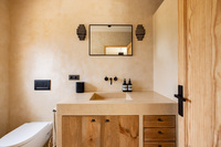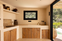 The villa has 3 bedrooms and 2 bathrooms, set over 2 floors. You’ll find a large kitchen with an eat-in dining table, as well as a separate living room centered around a fireplace. This leads to a guest bedroom with a kingsize bed and the second bedroom with 2 single beds, ideal for kids. The primary bedroom is upstairs, with a super kingsize bed and a private terrace. The main bathroom has a walk-in rain shower. Outside there's a deck patio, dining table, pool and loungers, as well as a pool house with an outdoor kitchen with a built-in BBQ.