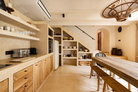 Boho finca. This rustic farmhouse has been brought up to date with a recent refurbishment by a design studio, with contemporary interiors to create a relaxed yet stylish home. Seagrass textures and rustic wood materials add to the laid-back look, while the sophisticated neutral color palette still feels fresh and modern. We love the striking black and white artwork, the timeless striped linen and the stylish pool house kitchen.