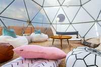 Contemporary comfort in the desert. A thoughtfully designed home where luxury, humor and modern style interplay. Interior spaces have been styled with subtle sophistication and minimalist modernist flair to create a stylish base with a homely feel. Earthy tones are combined with geometric patterns and generous use of natural fibres to add texture. The artworks and textiles add fun pops of color and playfulness to the rooms, reflecting the bold and everchanging desert skies. Outside, the yard invites relaxation with several chill out seating options, the hot tub spa and the serene den-like dome. The sunken firepit emulates the campfire experience so guests can peacefully watch the sun set over the mountains or gather together beneath the stars, gently warmed by the flames. We love the geodesic dome with its soft beanbags, nomadic floor cushions and climate control giving off real desert retreat vibes. The perfect space for families to commune together, or enjoy a peaceful moment apart.