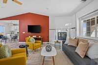 This property has 3 bedrooms and 2 bathrooms set over 1 floor. The living areas are set up open plan style with a cozy sofa set with bright modern chairs, in-built fireplace, and wall mounted flat screen TV on 1 side and a kitchen/dining area occupying the other. The dining table seats 4 with a breakfast bar seating an additional 4 close by, opening directly onto the terrace where more seating is available. The kitchen is fully stocked with all the necessities, including a coffee maker and filtered drinking water. There are 3 beautifully styled bedrooms spread out throughout the house. The primary bedroom has a kingsize bed with Apple TV and a private ensuite bathroom; the second bedroom has a queensize bed while the third ‘back bedroom’ also has a queensize bed and an Apple TV. The music room which is just off from the kitchen has a full size pull out sofa bed in addition to a guitar, keyboard and telescope. There is a games room with bar table, billiards table, in-built fireplace, TV, and Arcade game player. The outside space is fully gated and includes a patio with a pergola, a lounge sofa set, a dining table seating 6, a BBQ, sun loungers, a hammock and a dream catcher chair. There is a 6 person hot tub, fired by 2 motors, just off the patio. Paved stones lead down the yard to a sunken firepit surrounded by camp fire seating. The feature polyhedron dome is towards the yard’s end and includes climate control, poufs and pillows for ultimate relaxation.