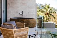 Tropical luxury, serene island getaway. Villa Asi is an architectural marvel which pairs open plan, cutting-edge design with contemporary interiors and high-end furnishings. In this calm and private oasis, you’ll find rooms that flow into one another, oversized windows that look out onto the sparkling sea and a textural mix of marble, stone and wood. Bedrooms are romantic with white drapes, a four-poster bed and luxury linens. Delicate orchids adorn natural wood and at the villa’s center is a Zen garden with pools and ornamental urns. We love the freestanding stone bath tub that looks out onto the bay; the striking black and white portraits of Thai tribes people in the magnificent living room; and the open vistas of sea and sky.