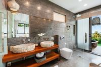 Villa Asi has 6 ensuite master bedrooms – all have super kingsize beds, TV with streaming services incl. Netflix and AC. Several bedrooms also come with a private balcony with outdoor furniture, walk-in closet, safety box and a sofabed. The villa is arranged as a stunning split-level complex. An open plan living space comprises a living room, kitchen with breakfast bar and dining room. The well-equipped kitchen is serviced by a chef, and the shaded alfresco dining area (seating 12) and gas BBQ area are ideal for sundowners and meals under the stars. A 2-level infinity pool has a cascading waterfall and surrounding chill zones. There is also a fully-equipped gym including free weights and a running machine.