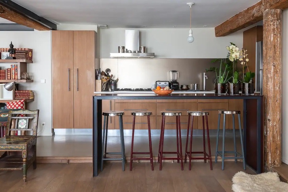 This bohemian chic apartment in an former leather workshop, 5 minutes’ walk from Le Marais, is a dream pick for those who love to travel, and sleeps up to 5. Decorated with exotic artwork and sculptures and with a bedroom evoking the style of a traveling caravan, it’s worldly, interesting and unique. Best of all, for this part of central Paris, it also has a small outdoor space in the shape of a shaded deck with a seating area, ideal for a lazy lunch. It’s in a great location, close to restaurants, cafés and boutiques of Le Marais and is well connected via metro with the rest of the city, making it perfect for urban explorers. The kids rooms all have charpoy beds and housekeeping is included in the rate.