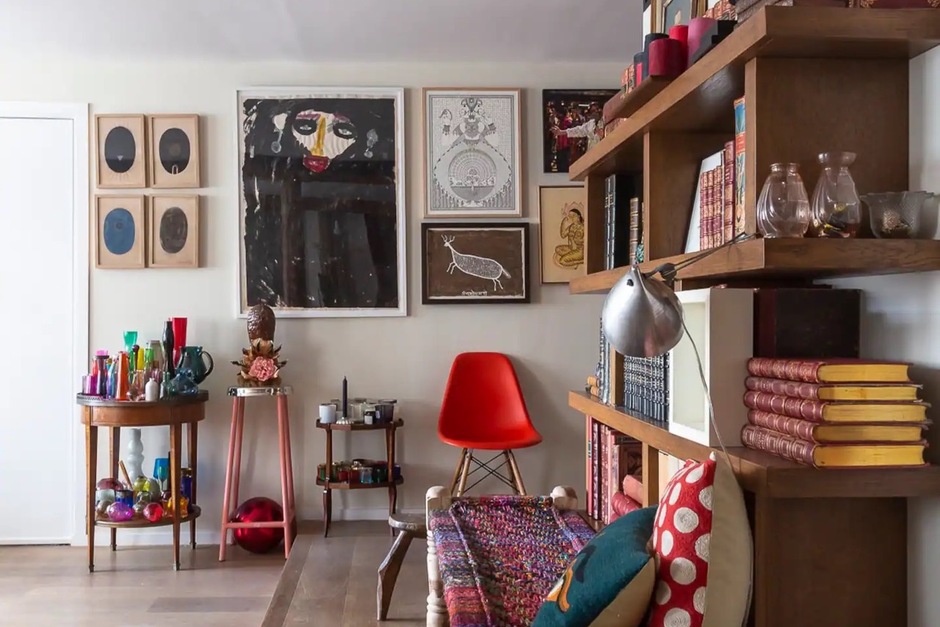 Modern bohemian. With unique design and artwork, books to browse and a paper-mâché sculpture of a polar bear in the hall, this apartment is a real one-off. The charpoy beds make staying here an exotic adventure, while wallpaper details, exposed beams and modern touches create joyful corners throughout. We love the beautiful details and boho style: fairy lights, art, Buddha busts and carvings from around the world.