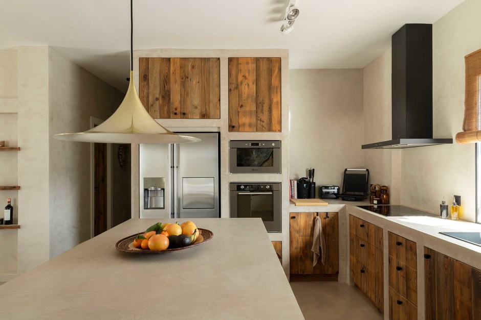 Boho meets minimalism. This stunning villa has been carefully curated by the hosts, who are experts in furnishing holiday homes. They’ve combined laid-back Bohemian styles with unique vintage finds, balanced with contemporary touches such as concrete kitchen countertops and black hardware in the bathrooms. The walls are consistent throughout, with a simple bare plaster effect, paired with calming beige, ecru and neutral tones to create a zen-like atmosphere to help you relax during your stay. We love the rustic wood kitchen cabinets, the rough textures and natural rattan materials used throughout and the retro-style palm print sun loungers.