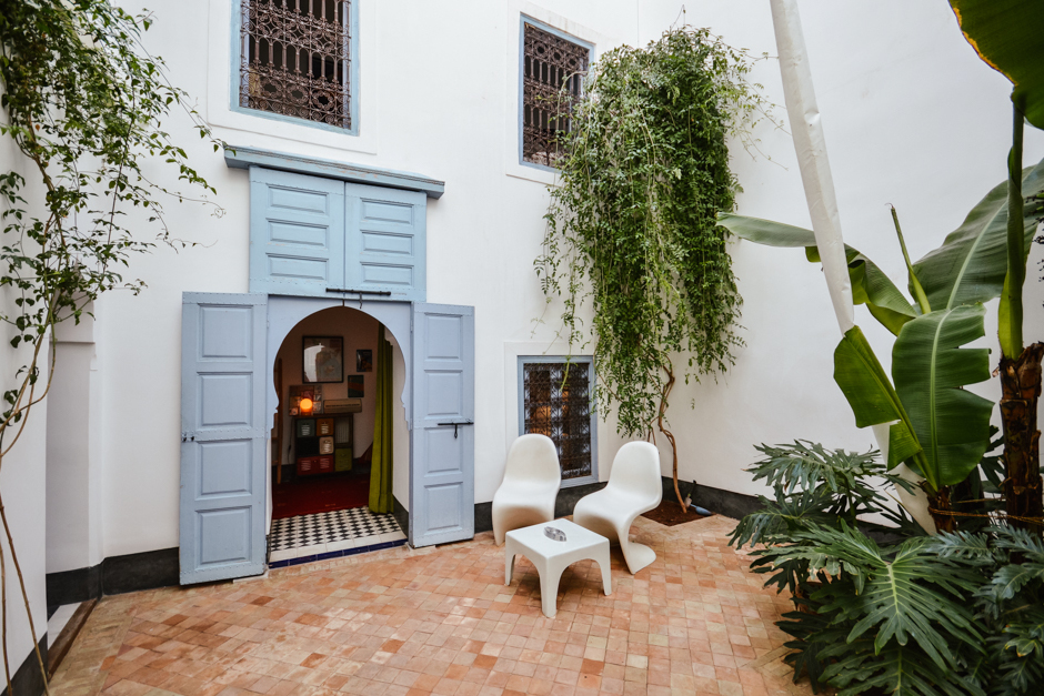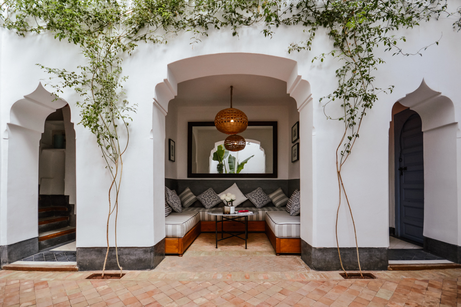 Classic Riad. This beautiful home includes contemporary European decor and Moorish touches, with banana trees on the patio, colorful bedrooms and Scandinavian touches in the master bedroom design. The cozy reading room is an added delight; we also admire the smooth tadelakt bathrooms, the cozy sitting nooks and the tropical plants throughout. We love dreaming about sipping mint tea on the rooftop patio, admiring the stars at night, and relaxing after a busy day exploring bustling streets full of treasures with a relaxing evening by the fire.