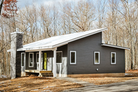 This 3 bed/2 bath upstate New York home is set on 5 acres and has a scenic deck. Inside, the spacious and minimalist rooms include a large living room with a wood-burning fireplace and 2 spacious, configurable sofas. The 3 bedrooms all have queensize beds; there is also a queen sofa bed in the basement and 2 twin sofas in the living room. There is an extra inflatable mattress. There is a large kitchen open to the dining table and living room, a screening/media room, and 3 bathrooms with a mixture of bathtubs and walk-in showers.