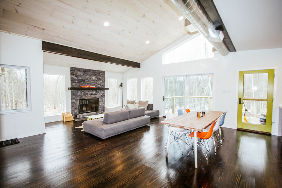Modern country. The house is designed as a Mid Century modern ranch and the layout is fully open and furnished with colorful designer furniture. The homes in the area tend to be more traditional in style, so this is a good choice for those looking for a more modern aesthetic. The modern, colorful look continues inside with minimalist and beautifully designed spaces, white walls and wooden floors. Clutter is banished in place of light-filled spaces and views of the woods. We love the countryside setting, the modern finishes and the fantastic kitchen.