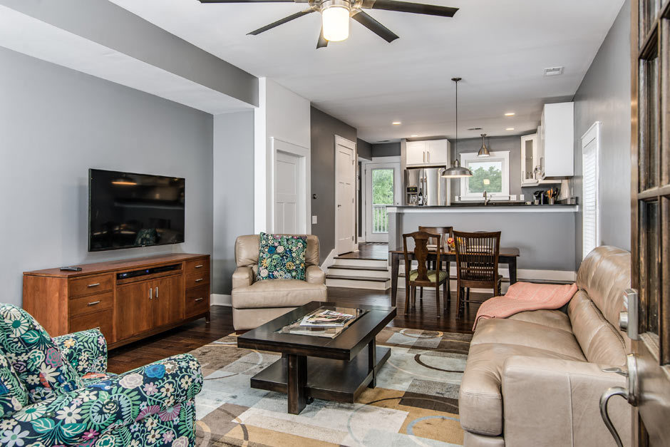 Bright and minimalistic. This new home with light walls and modern finishes has a fresh aesthetic. The front porch is a welcome entrance and the beautiful exterior architecture nods to Southern charm. Inside, a stainless steel kitchen, concrete basement floors and contemporary bathrooms feel sleek. The twin beds are Temperpedics and a Keurig coffee maker is provided in both kitchen areas. We love the landscaped gardens and unique urban views.