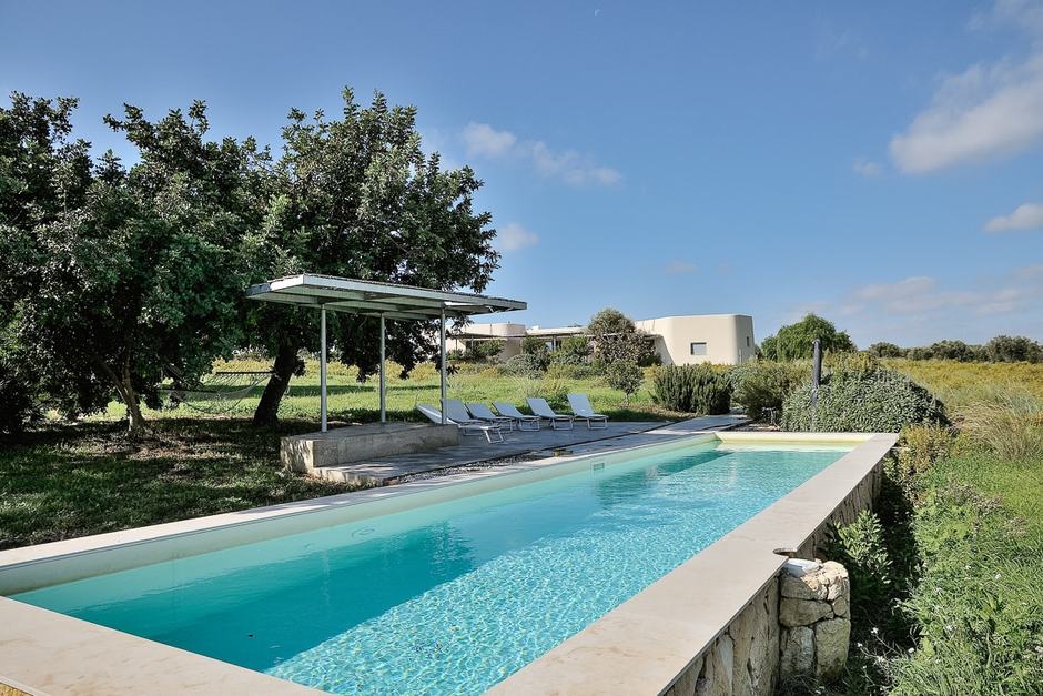 Rural, minimalist beauty. This architecturally stunning building blends effortlessly with its abundant natural environment. The interior is thoughtfully decorated with clean lines and contemporary furniture. There are superb views of the sea, surrounding carob and olive groves, and the nature reserve from the roof terraces and the beautiful beaches of Vendicari are only 5 minutes away. We love the al fresco dining space where you can eat surrounded by the scent of jasmine, the lovely open space of the living room that flows to the outside through sliding doors, and the modern simplicity of smooth white floors and walls – less is definitely more here.