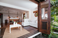 This 6,600 sq ft oceanfront villa with an infinity edge private pool is glamorous and luxurious. The 3 indoor courtyards bring nature in. Windows offer fabulous ocean views. There is a mix of farm house, great house, Caribbean villa and modern luxury in the design. We love the hardwood floors, the tropical plants and the soft furnishings, including cowskin rugs and white linens.