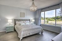 Light-filled and stylish beach house. Built in 2019, this house was designed in the coastal farmhouse style, with mostly white and blue accent colors. It is bright and airy with large windows, complemented by light tones and spacious interiors, giving it an atmosphere of both comfort and casual elegance. The house also offers a bit of luxury with its quartz countertops in the kitchen and both bathrooms, as well as designer light fixtures throughout. We love all the thoughtful touches – from the brightly-colored Adirondack chairs in the covered deck and around the firepit, to the beach-themed textiles on the dining room chairs and ocean-inspired decor in every room.