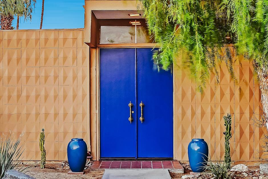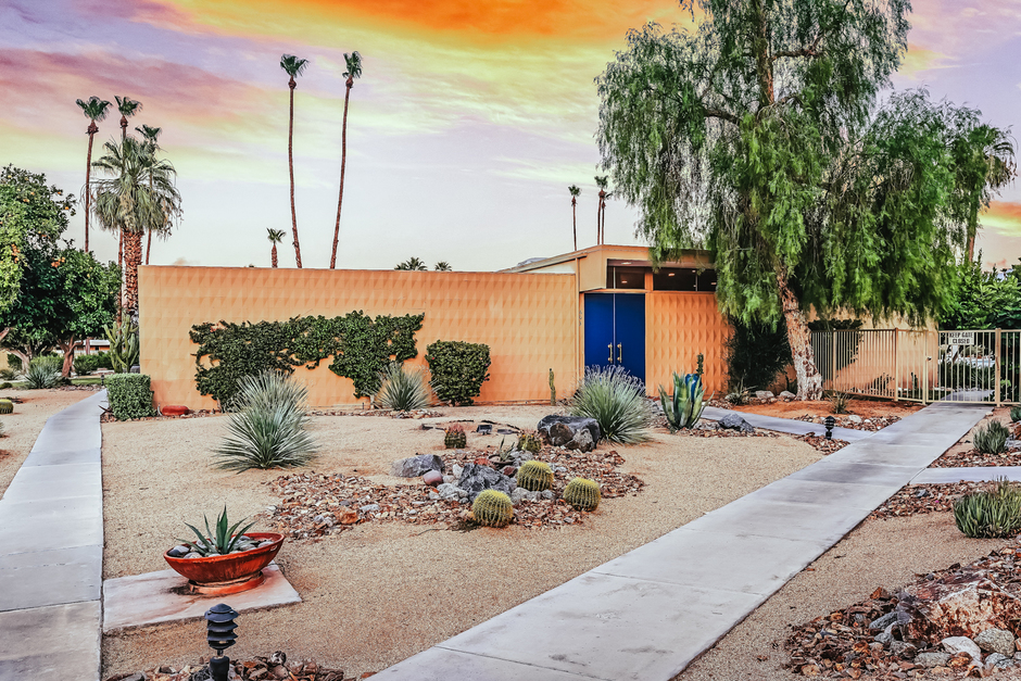 Mid-century condo. This historic community is one of the finest mid-century modern sites in the Coachella Valley. Designed by world-renowned architect William Krisel and built in phases between 1958 and 1969, this recently renovated property retains a true Californian style, with classic cacti plants, bright colors and warm wooden textures. Floor-to-ceiling glass sliding doors create stunning views of the spectacular scenery, while the polished floors look sleek and stylish. We love the retro artwork on the walls, the luxuriously large double sinks and the warm blue exterior tiles.