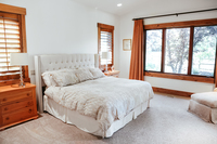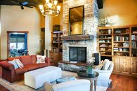 Mountain chic. This spacious Park City home includes traditional mountain details and luxurious furnishings. Exposed wooden beams, natural wood trim, wide plank hardwood flooring, stone details and rustic lighting add comfortable, rustic notes while the vaulted ceilings, large windows, natural light and gorgeous mountain backdrop feel bright and airy. We love the wood-burning fireplace and landscape art.