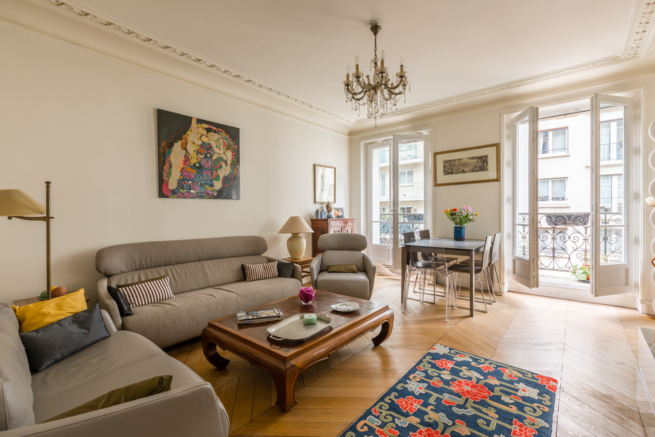 Sophisticated and ornate. This classic French apartment boasts a whole host of traditional features, including parquet flooring, original doors and built-in bookshelves. We love the historic ceiling coving, the one-of-a-kind armoir in the second bedroom and the contrasting monochrome kitchen.