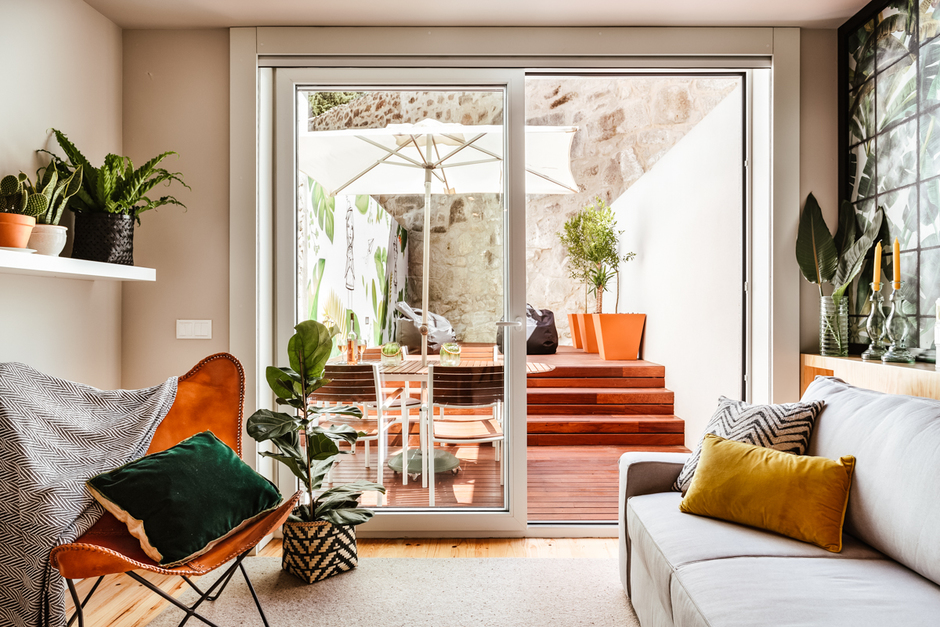 City chic. Crisp, cool and contemporary, this apartment has been decorated with a Portuguese flair for colour. Neutral, modern backdrops show off the rich forest greens, orange and yellows. Wooden flooring and taupe walls throughout give a practical, modern vibe. We love the tropical jungle backdrop in the living space, the gorgeous petrol blue and white geometric tiles in the bathroom and the cute mural, painted by Costah, one of Porto’s most famous street artists, in the decked, bijou garden.