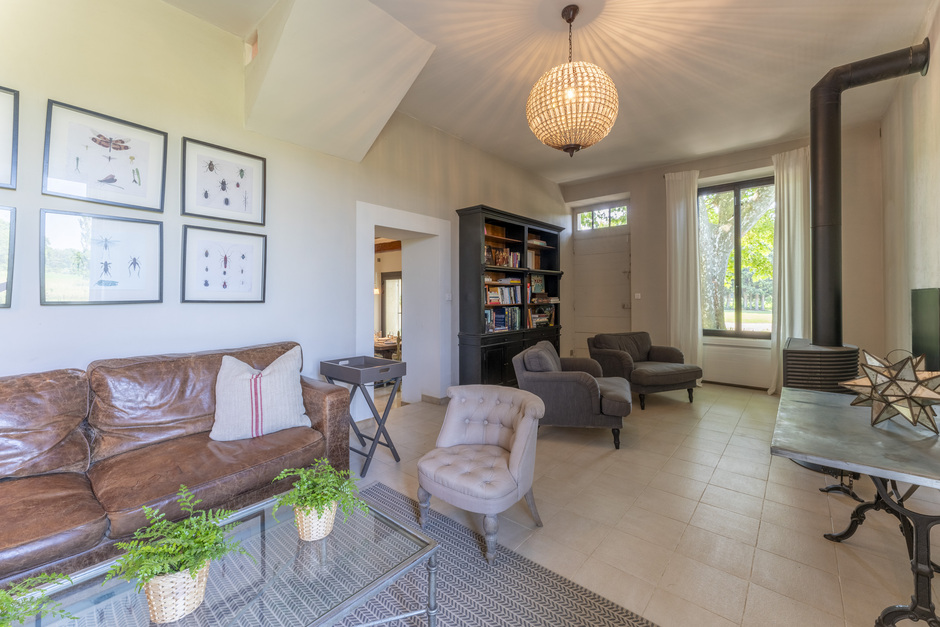 Rustic elegance. The renovated farmhouse and cottage both offer modern comfort and are decorated in a simple and timeless manner with antiques, custom made furniture, and curated pieces from local markets. The spaces are bright and clean, with no clutter. Design touches include an antique desk from a French primary school, woven rattan animal trophies in the children's room, unique finds found in the local markets, original art work, and the exceptional outdoor space. We love the contemporary fireplace, the oat-toned window shutters and the elegant outdoor seating.
