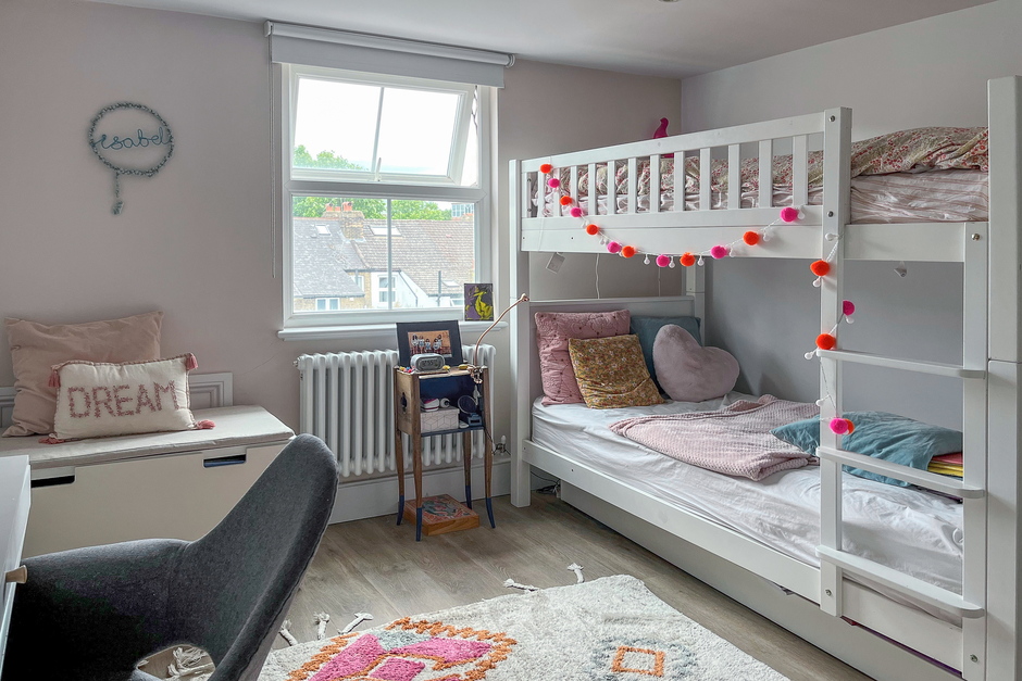 The house has 5 bedrooms and 4 bathrooms, set over 3 floors. Downstairs there is a front room, a cinema room/playroom and a newly-renovated open plan kitchen/dining room with luxurious fitted units with integrated appliances, which opens up to the south facing garden with full width sliding doors. The open plan living area and kitchen area have zoned areas allowing you to enjoy a meal while the children watch TV in the room next door. This floor also has a WC and ample storage. Upstairs on the first floor, the primary bedroom boasts a kingsize bed, walk-in wardrobe and ensuite bathroom with a bathtub. This floor also has a children’s room with a single bed (plus a single trundle bed), a study/nursery and the family bathroom. On the top floor, there is a bunk bedroom, a double bedroom and a separate shower room.
