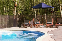 This 5-bedroom, 3.5-bathroom 3600 sqft property has an open floor plan on the main level with a living room, gourmet chef’s kitchen, main level family room/den with queen pull-out sofa bed, home office and a formal dining room with seating for 8. The basement holds a media room with TV, surround sound system, ping pong table and arts and crafts nook, plus a queensize sleeper sofa bed. Bedrooms are split across 3 levels. On the upper level there is a master suite with kingsize bed, ensuite bathroom and 2 walk-in closets, plus 2 guest bedrooms, 1 with fullsize bed, twin bed and twin trundle, and the other with a bunk bed (fullsize bed on the bottom, twin on the top). On the main level there is a master suite with 1 queensize bed, an ensuite bathroom and a door to the back yard, and there is a further guest bedroom with a queensize bed on the lower level. Outdoor space includes a heated gunite saltwater pool, chaise lounge chairs and umbrellas, outdoor shower, hot tub, fire pit, and a large deck with dining table and outdoor propane grill.