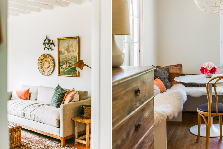 Spanish charm. Light and airy, this guest house has a beachy, modern feel despite the original Spanish details: check out the original Spanish tile roof and Saltillo tile patio floor tiles. The hosts have chosen hardwood floors, butcher block countertops and neutral tones to create a subtly contemporary space that feels calming and minimalist, but also relaxing for parents and families. We love the antique wooden furniture, the mix of textures in the bedrooms and the bright color-block patio.