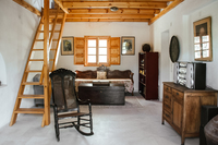 Strictly Cycladic. The architecture is Cycladic in style, and the houses are made from natural local materials and designed with traditional Cycladic bioclimatic principles to make them cool in summer without the need for air conditioning. Furniture throughout has been collected from Santorini or made to order by local technicians. Decor includes a variety of art pieces, ceramics, paintings, icons and book collections. We love the curved ceiling at the top, the rainbow-striped hammock and the location, a stroll from the beach.