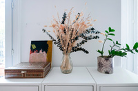 White and light. A fresh white color palette is punctuated with pops of color, from the bold blue sofa to the patterned rug and minty green tiling. We love the gorgeous high ceilings and traditional cornicing in the living area, the unique marbled fireplace in the bedroom and the elegant Parisian parquet flooring.