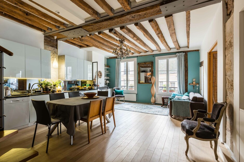 This apartment is nestled between Le Marais and The Seine, in the 4th arrondissement. The nearest subway stations are Saint-Paul, Pont Marie and Hôtel de Ville, all just a few minutes’ walk. It’s just 10 minutes’ walk to the historic Notre Dame cathedral and 20 minutes’ walk to the Louvre. The international airport is around 45 minutes by car or train.
