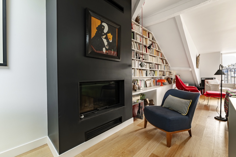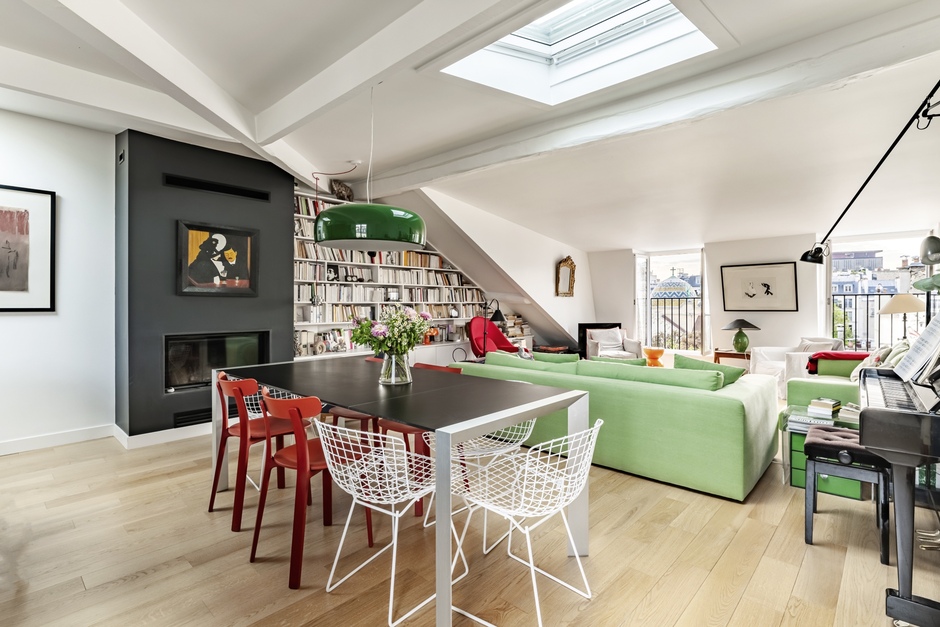 Loft living. Reflecting the musical and cultural history of the Montparnasse district, this enthralling apartment blends color and contemporary styling to create a creative and inspirational space. The black kitchen is punctuated with color from the neighboring living area, while the pops of color on the walls and woodwork add a fun splash to the hallway and kids rooms. We love the monochrome bathrooms, the modern integrated black fireplace and the exposed brickwork texture in the second loft bedroom.