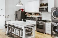 Modern loft. This apartment is bright, contemporary and furnished in an eclectic style. The hosts have used a white neutral palette and pared-back styling to highlight the building’s classic loft features, such as the super high ceilings and exposed brick walls, which are a great backdrop for the industrial-style kitchen. We love the large North American elk looking over the living room, the pops of brightly-colored furniture in the open plan area and the classic white tiled bathrooms.